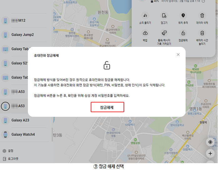 삼성 게정 ID와 패스워드 입력 후 로그인 해줍니다. 잠금해제를 선택해 줍니다.